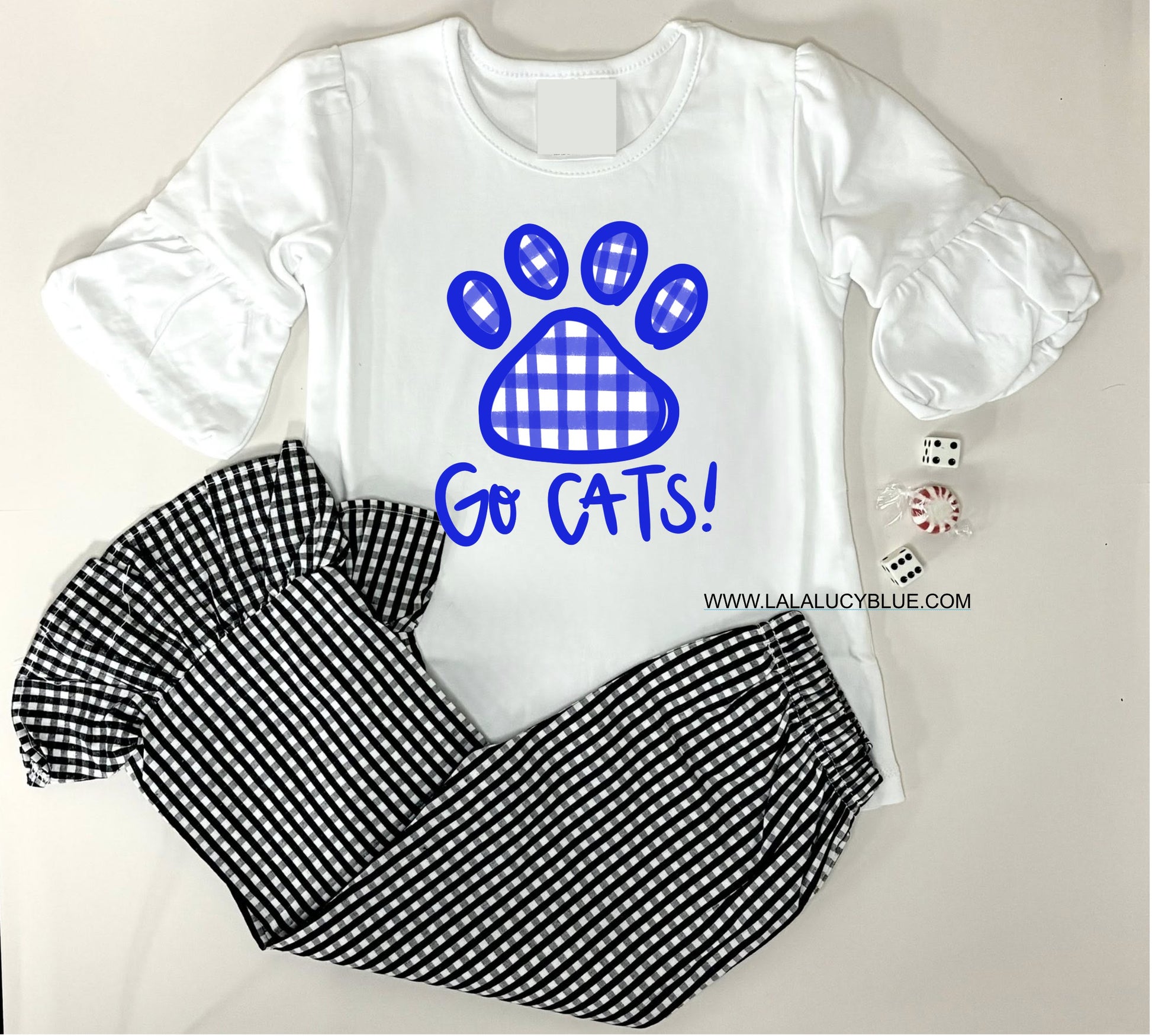 Show your Kentucky Wildcats pride with this adorable bubble sleeve top and checkered pants set! This stylish outfit is perfect for cheering on our Kentucky Wildcats at games, tailgates, or any day you want to represent your team.